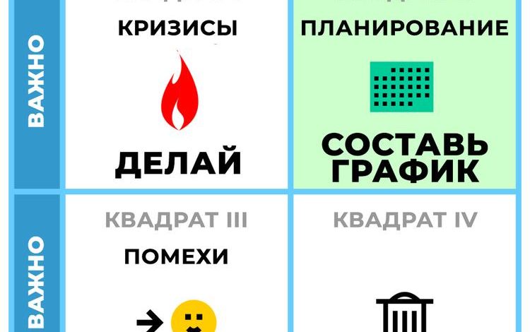 Матрица состоит из четырех квадрантов: срочные и важные, срочные и не важные, не срочные и важные, не срочные и не важные. Главное правило – делать сначала то, что важно, а потом уже то, что срочно. Этот принцип позволяет сосредоточиться на приоритетах и избежать постоянного пожаротушения.